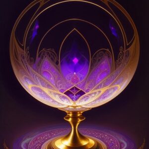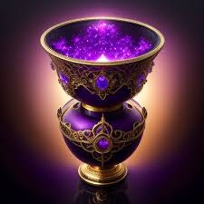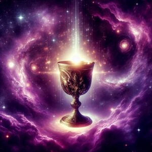 CREATING A SYMBOL WITH AI: For those curious about whether it’s possible to use AI to create an image for meditation, I generated the image below with a subscription to the website Shutterstock.com, using their AI feature. The words I entered as the prompt were: “ancient golden chalice in purple cosmos with divine white light pouring in from above”.