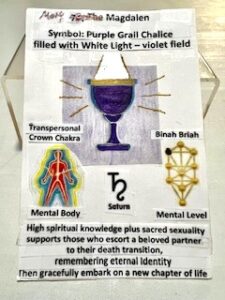 After pasting my hand-colored symbol on a 4×6 index card I also added various details about Magdalen’s correspondence, to help me remember more about the type of divine energy she extends within the overall Qabalah structure. Since she is met at the Sphere of Binah, I highlighted the location that Sphere on a tiny Qabalah diagram to remind myself that it is quite high on the Qabalah tree – where spiritual practice can carry us into brief experiences of Eternity. I also included the Symbol for Saturn (Binah’s Planetary correspondence), and a tiny image of the human energy field that I marked to show the Crown Chakra where contact with her occurs and noted that her mastery is at the Mental Level. Last, I pasted on some words to summarize Magdalen’s particular mastery. All these details, drawn from the information provided on her included in my book, were “extra” so I could remember them.